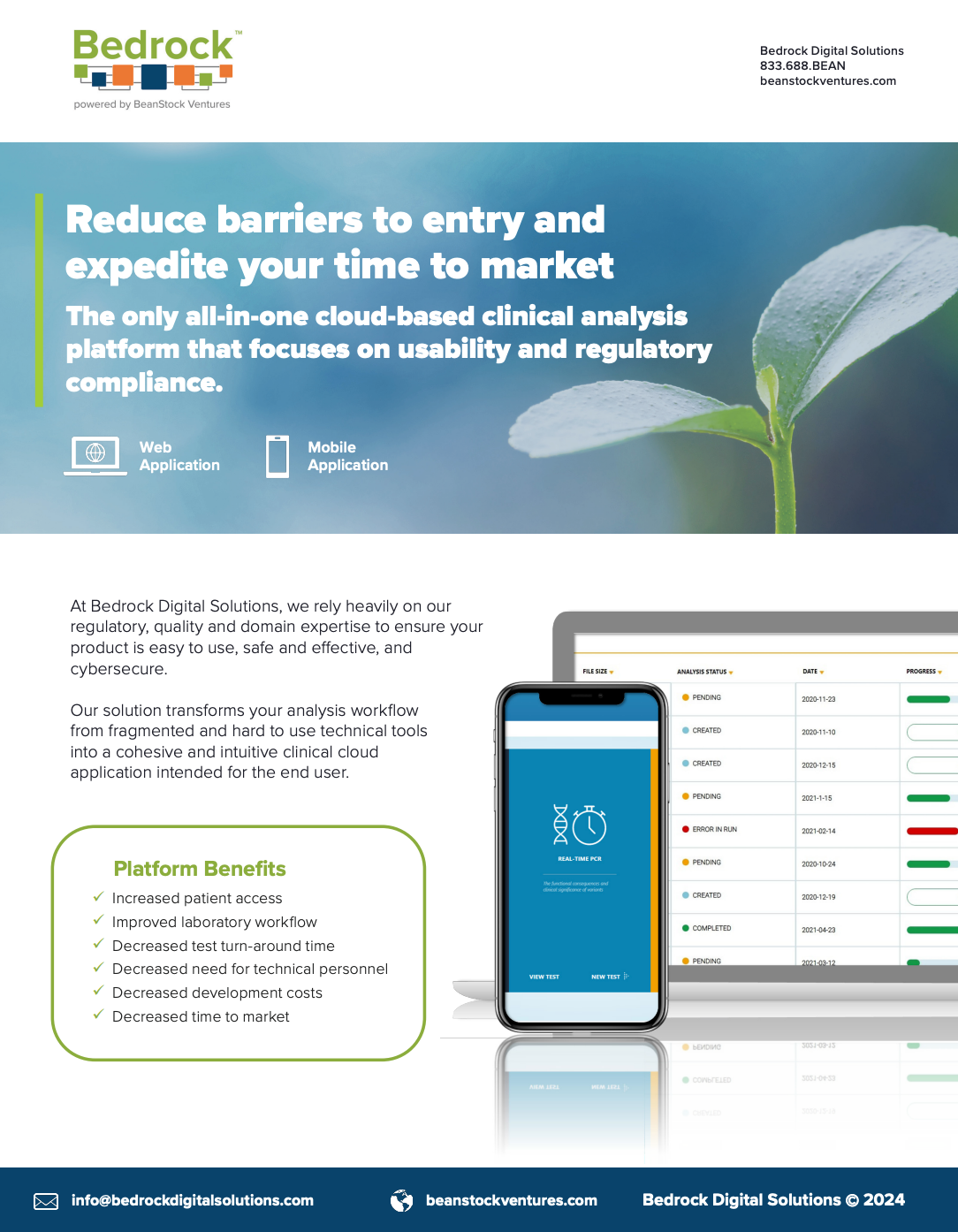 Bedrock™ is the only all-in-one SaaS, cloud-based clinical analysis platform designed for the healthcare and diagnostics industry, delivering unmatched usability, seamless workflow integration, and full FDA, Cybersecurity, HIPAA, and GDPR compliance—helping you launch faster, safer, and smarter.